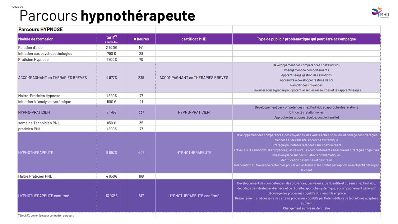 Depuis plus de 15 ans, MHD Formation prépare des personnes désireuses d’exercer un métier d’accompagnant, au métier d’hypnothérapeute avec pour projet, d’accompagner avec l’inconscient. À partir d’un socle commun aux parcours Thérapies Brèves, l’école MHD Formation propose 3 niveaux progressifs en fonction des projets de chacun. Il est possible d’exercer dès le premier niveau.